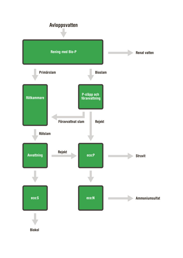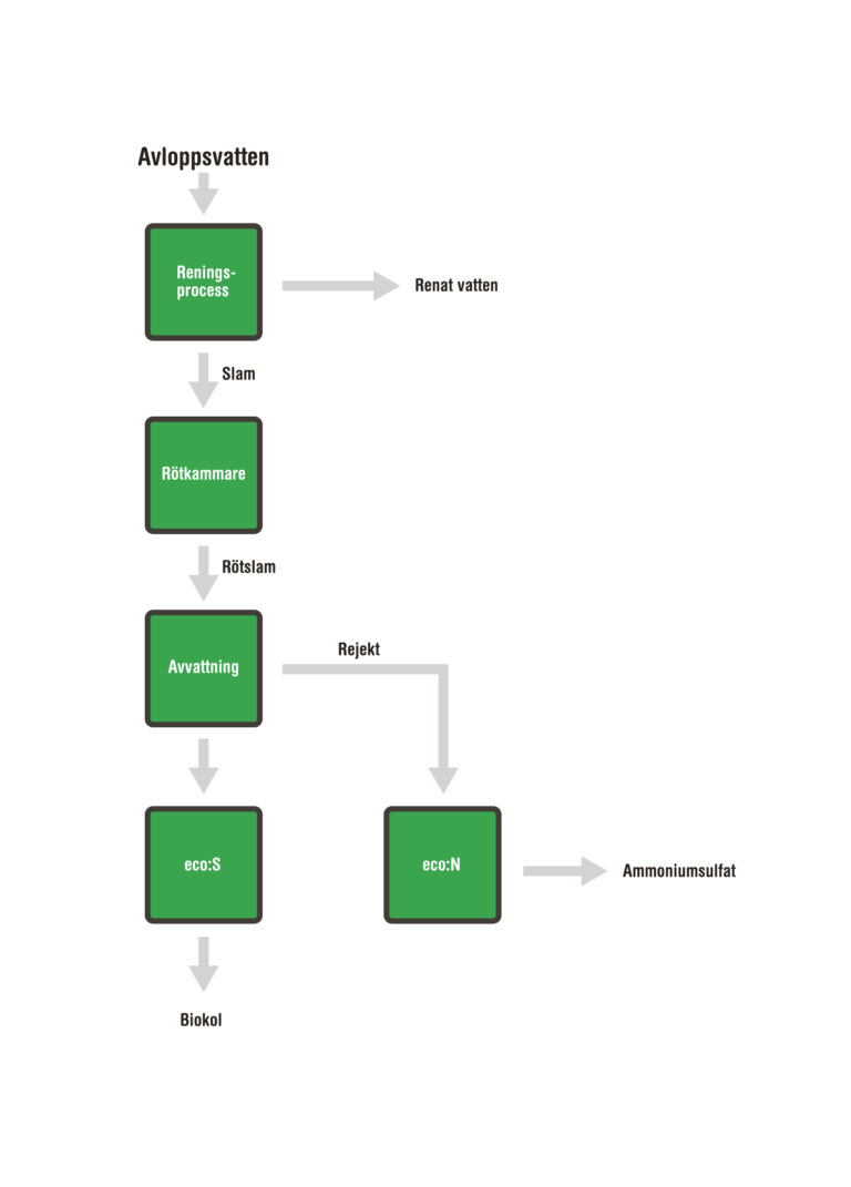 Här avskiljer vi fosfor både ur rejekt från föravvattnat bioslam/överskottsslam och ur rejekt från rötat och avvattnat slam. Avloppsströmmen innehåller fortfarande värdefull växtnäring efter eco:P och därför avskiljer vi även kväve i form av ammoniumsulfat med eco:N. Det avvattnade rötslammet gör vi slambiokol av med hjälp av vår teknologi, eco:S.